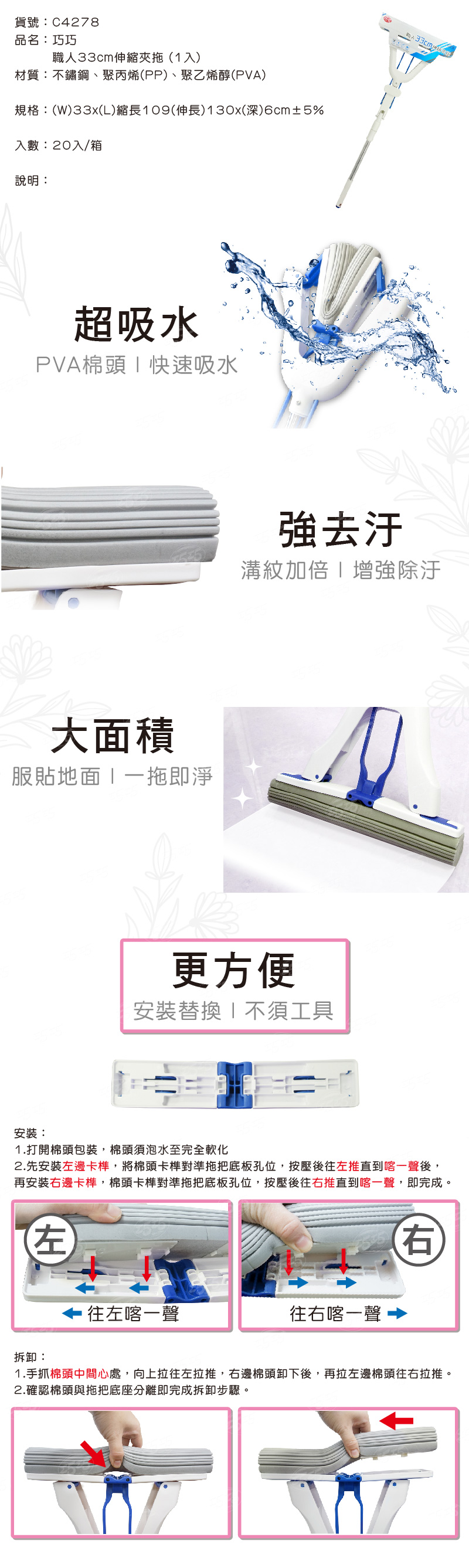 隆藝清潔用品 -- C4278/巧巧職人33cm伸縮夾拖