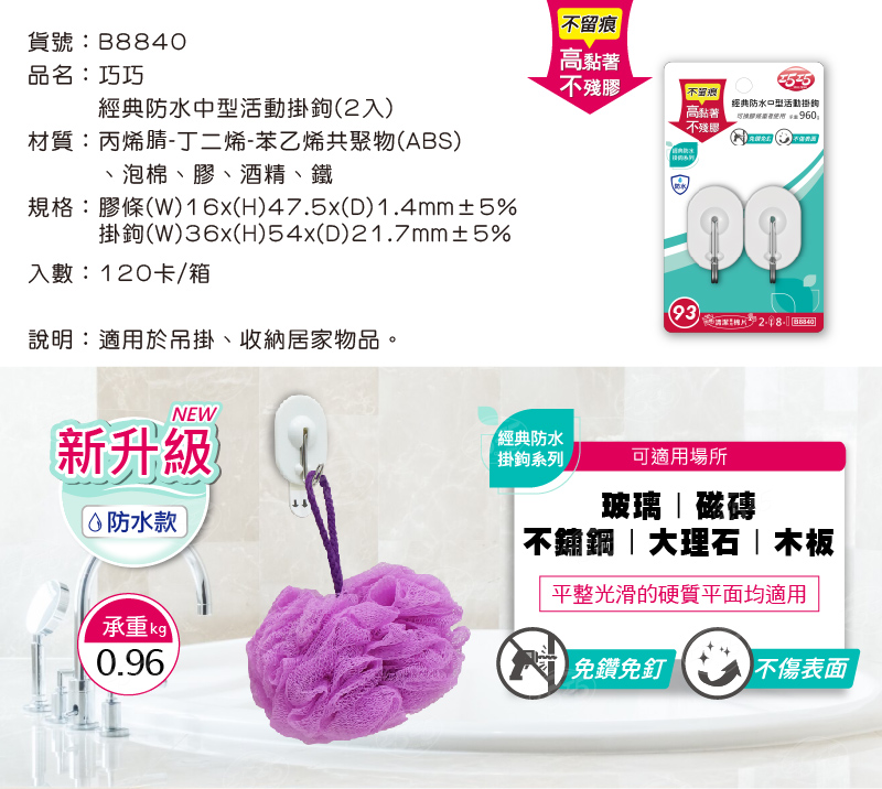 隆藝清潔用品 -- B8840/巧巧經典防水中型活動掛鉤(2入)