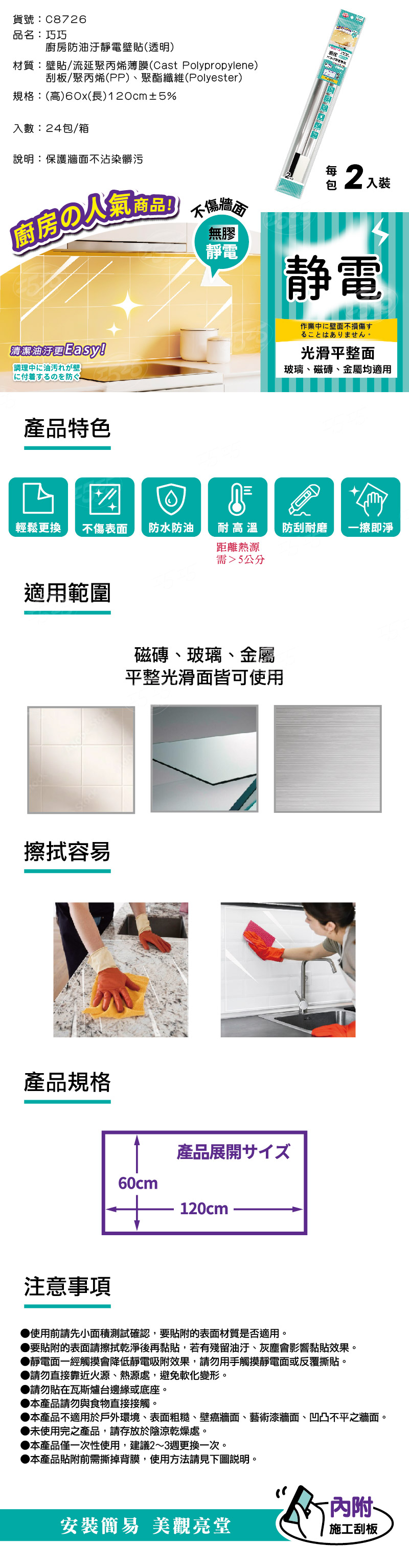 隆藝清潔用品 -- C8726/巧巧廚房防油汙靜電壁貼(透明60x120cm-2入)