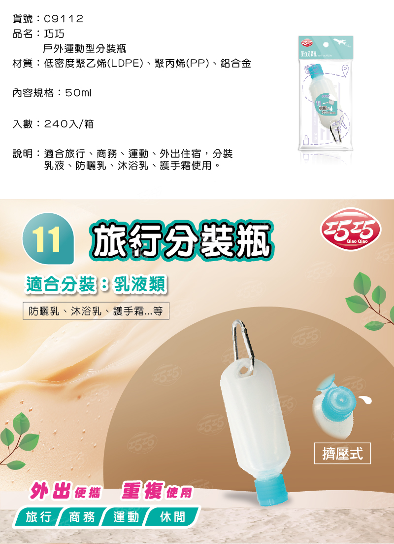 隆藝清潔用品 -- C9112/巧巧戶外運動型分裝瓶 50ml