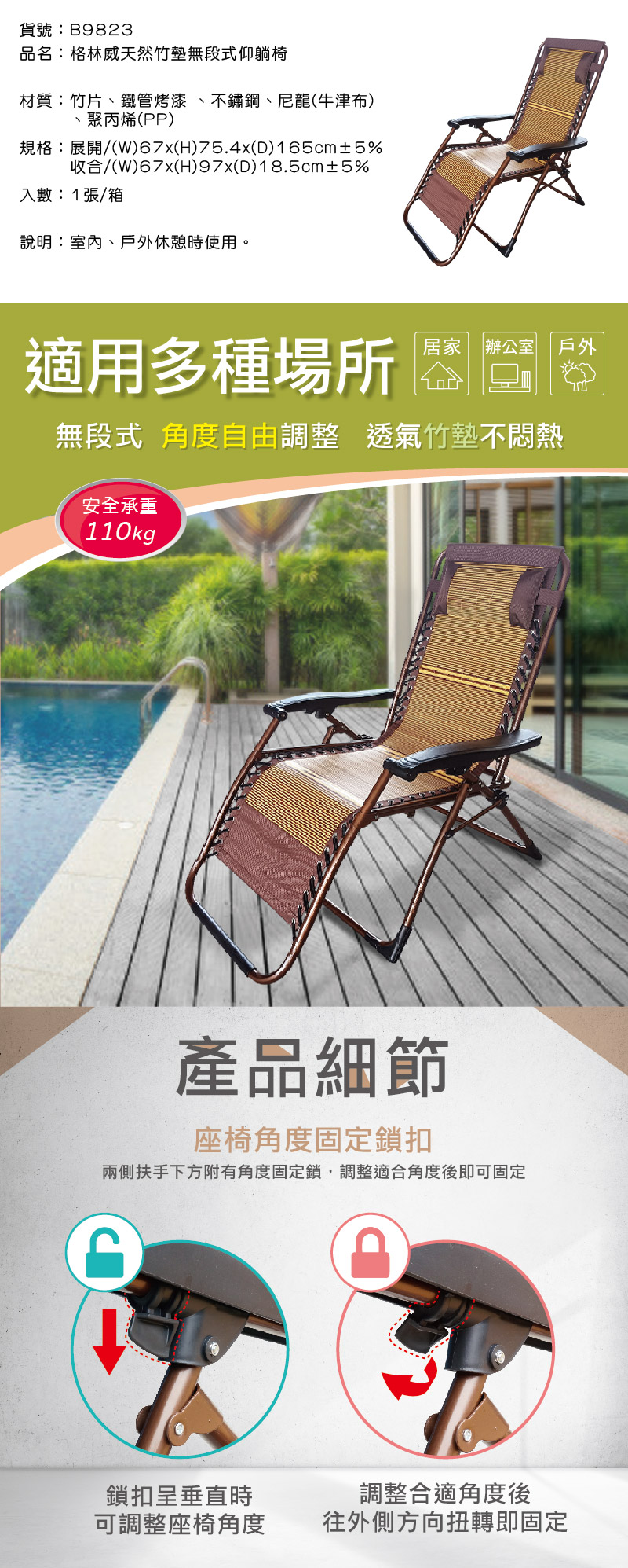 隆藝清潔用品 -- B9823/格林威天然竹墊無段式仰躺椅